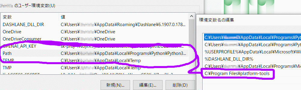 まずは、Android の platform-tools をダウンロードして、環境変数の設定を行いました。